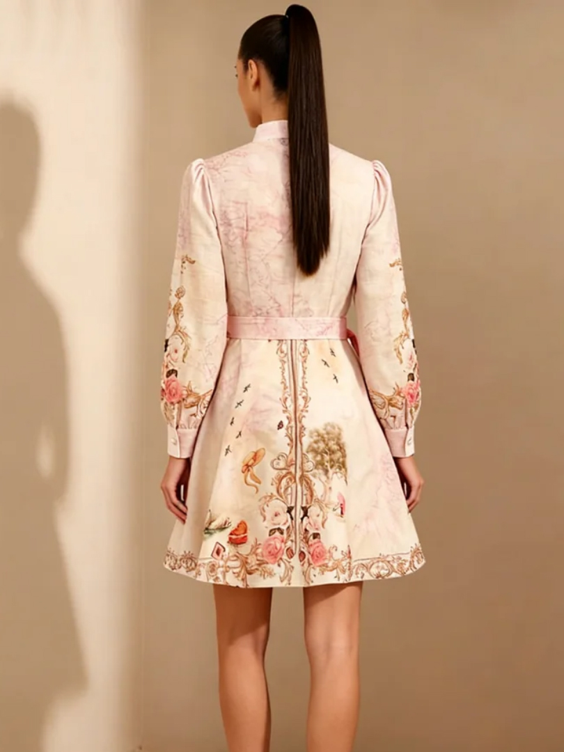 Ready stock floral-print belted mini dress button-down